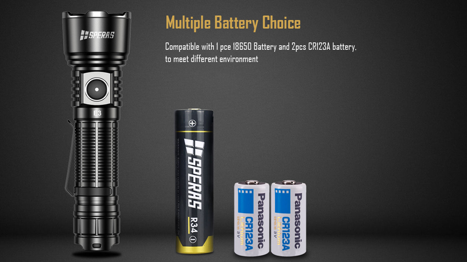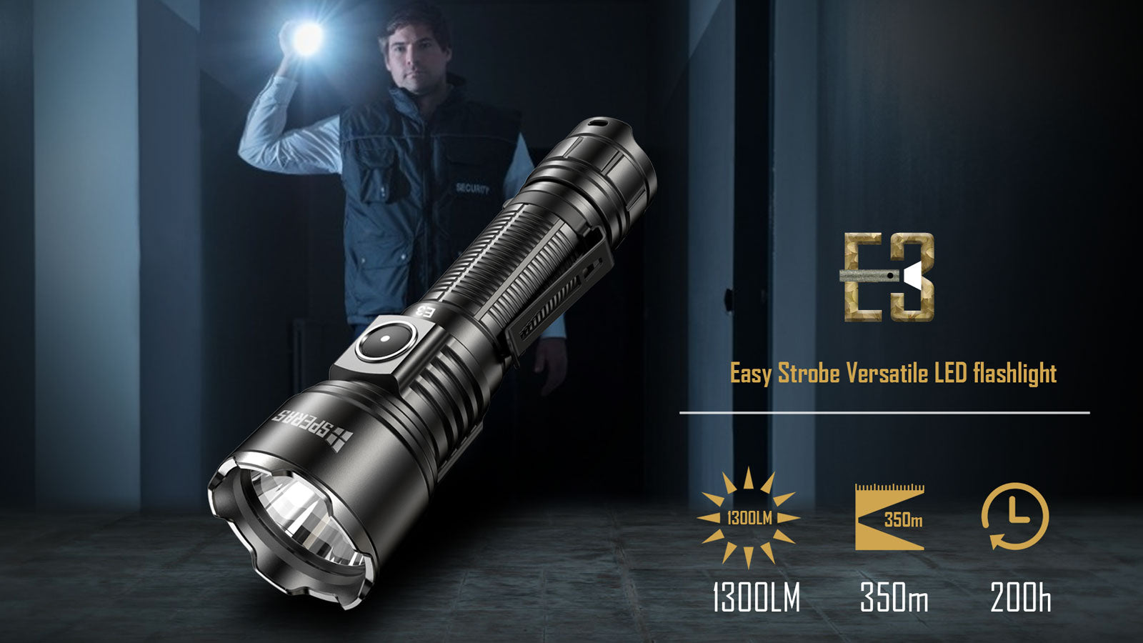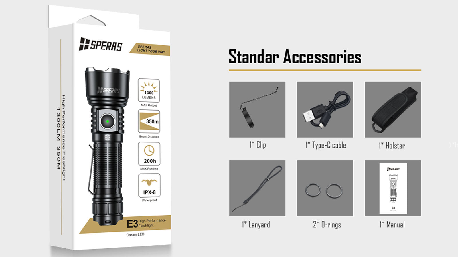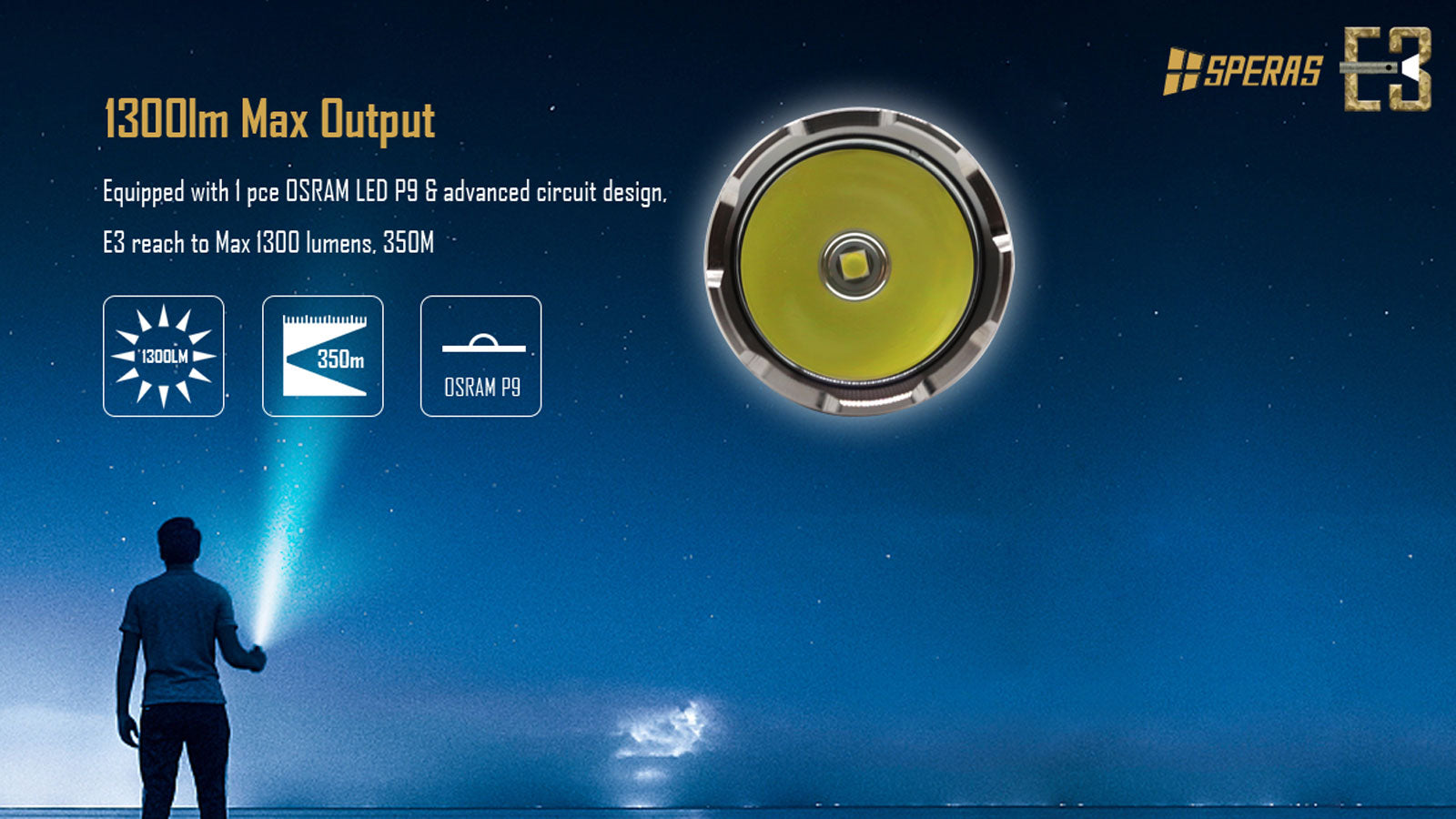 SPERAS E3 is a high-end 1300lm output LED flashlight, equipped with Imported Osram LED and advanced circuit design. It has side button and tail tactical switch button which provides you nice user interface, which is a great flashlight for tactical, outdoor, hunting, every day carry, etc.