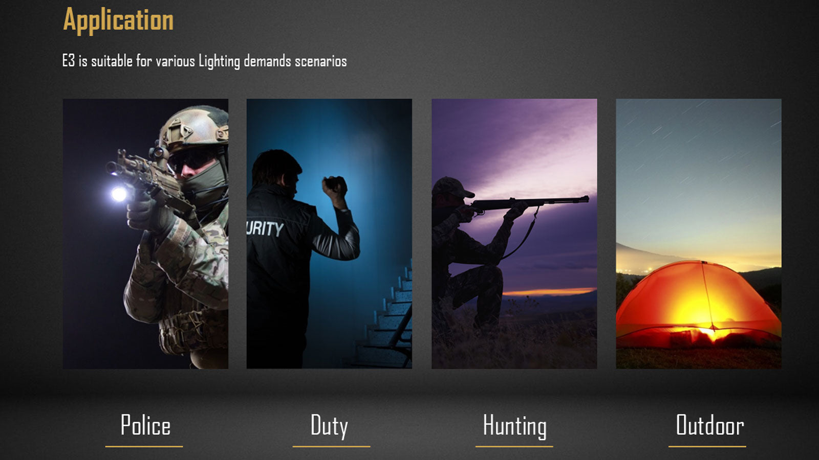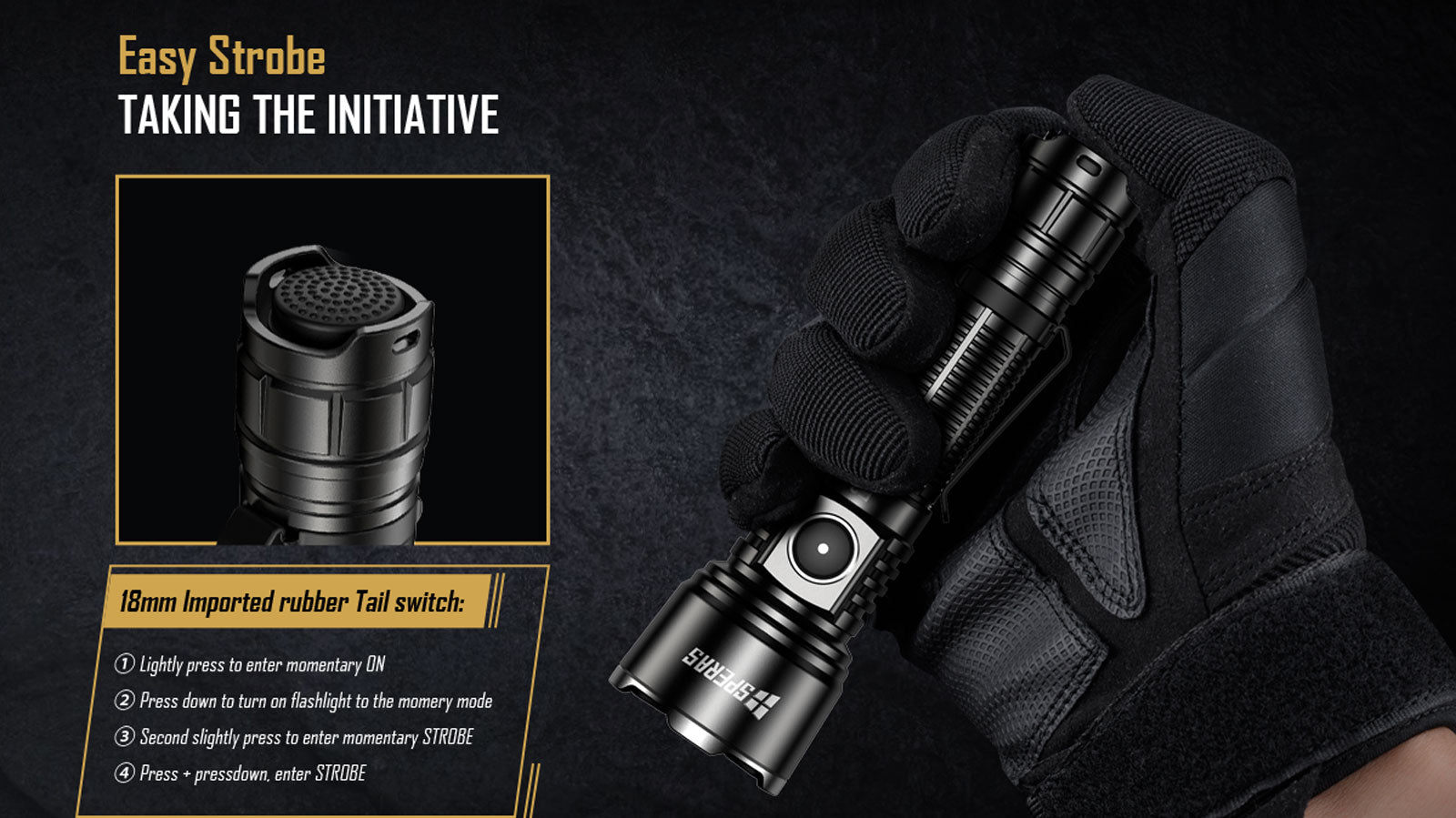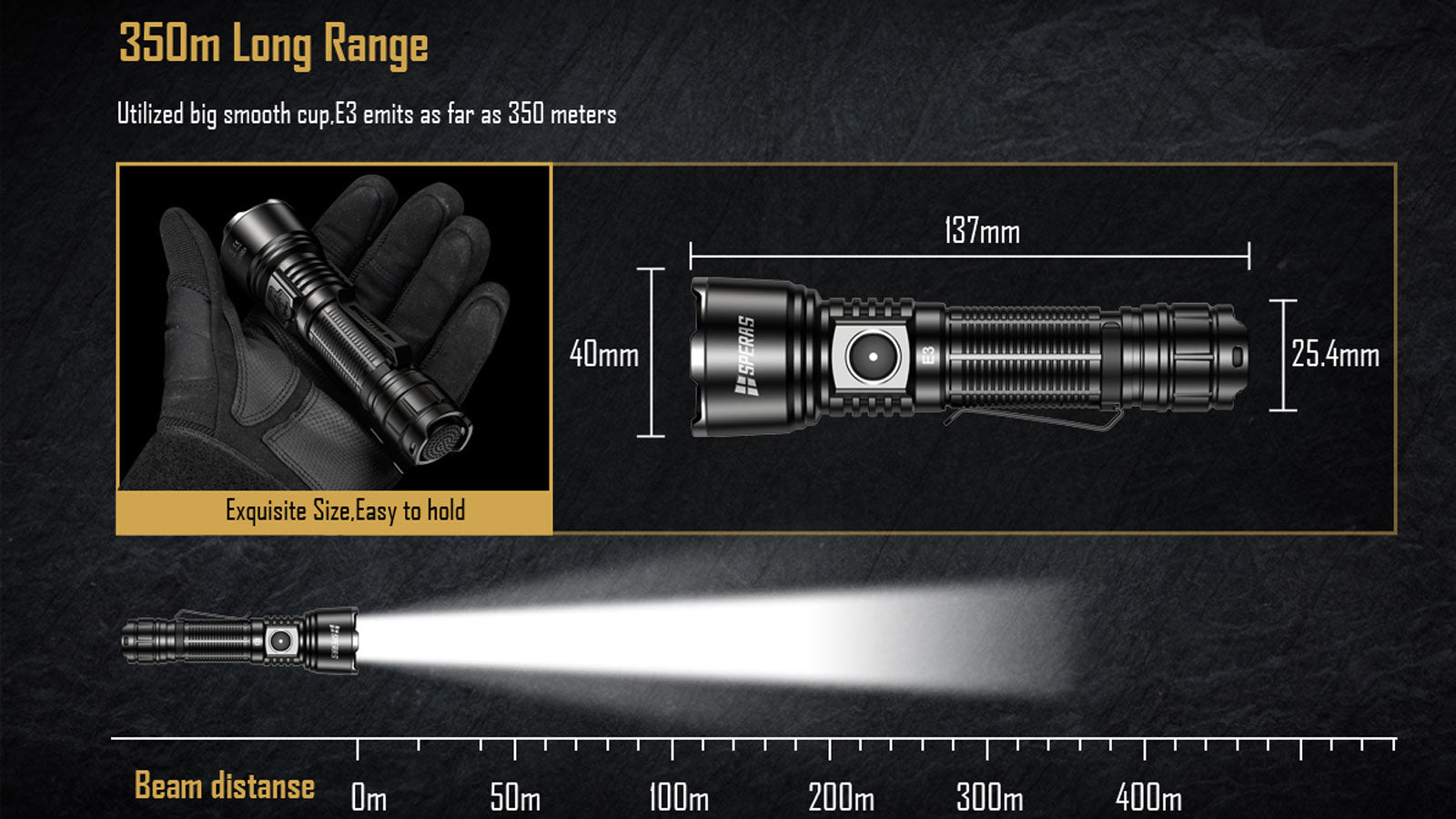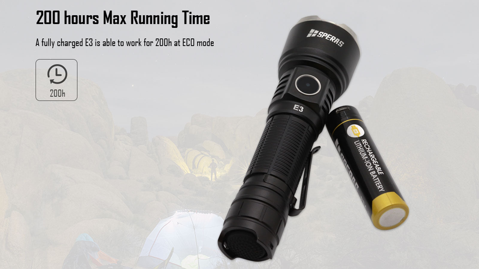 SPERAS E3 is a high-end 1300lm output LED flashlight, equipped with Imported Osram LED and advanced circuit design. It has side button and tail tactical switch button which provides you nice user interface, which is a great flashlight for tactical, outdoor, hunting, every day carry, etc.