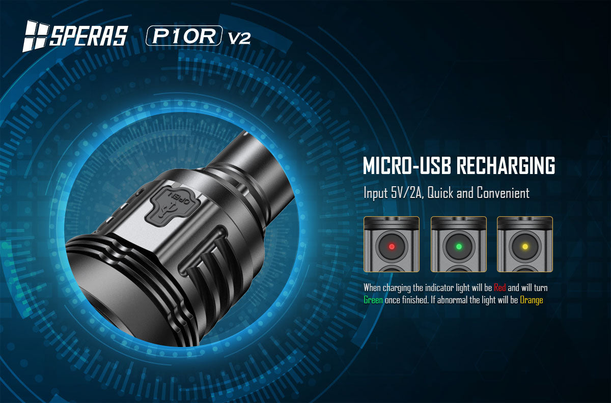 The SPERAS P10R V2 is a high performance, high lumen LED flashlight with 10000lm max output that utilizes 3pcs imported Luminus SST70 LEDs. The dual rubber buttons design, allows fast adjusting the mode with the bottom button and easily reaching to the turbo mode with the top button. Powered by a 10000mAh 21700 Lithium battery pack, it could achieve at a maximum runtime of 36H under 100 lumen stable output. It’s an ideal flashlight for searching, rescue, patrol or other outdoor activities. With the Lockout function, users can be assured that the flashlight will not unintentionally power on when put in the pocket or bag.