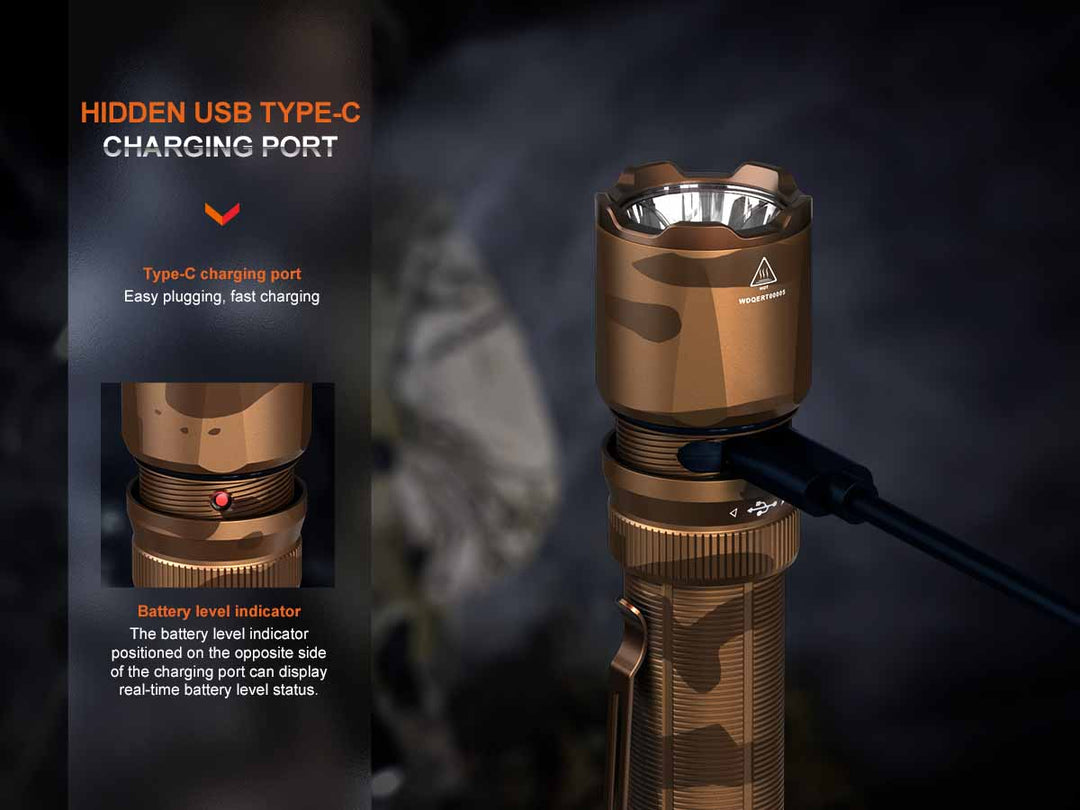 The battery compartment is designed with a double spring structure to keep the battery suspended, effectively negating external impact which helps avoid momentary power failures. This flashlight comes with four brand new colors - Desert Camo, Tan, Tropic and City Gray.